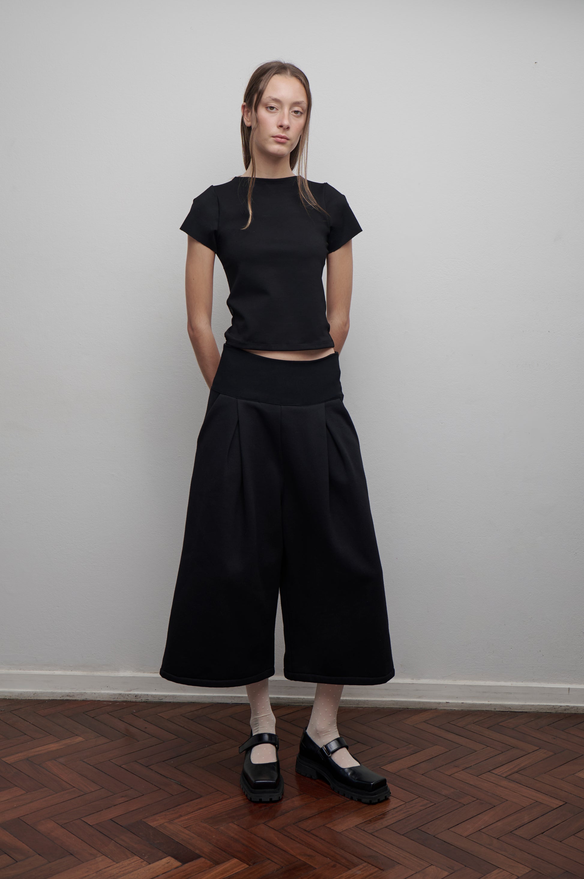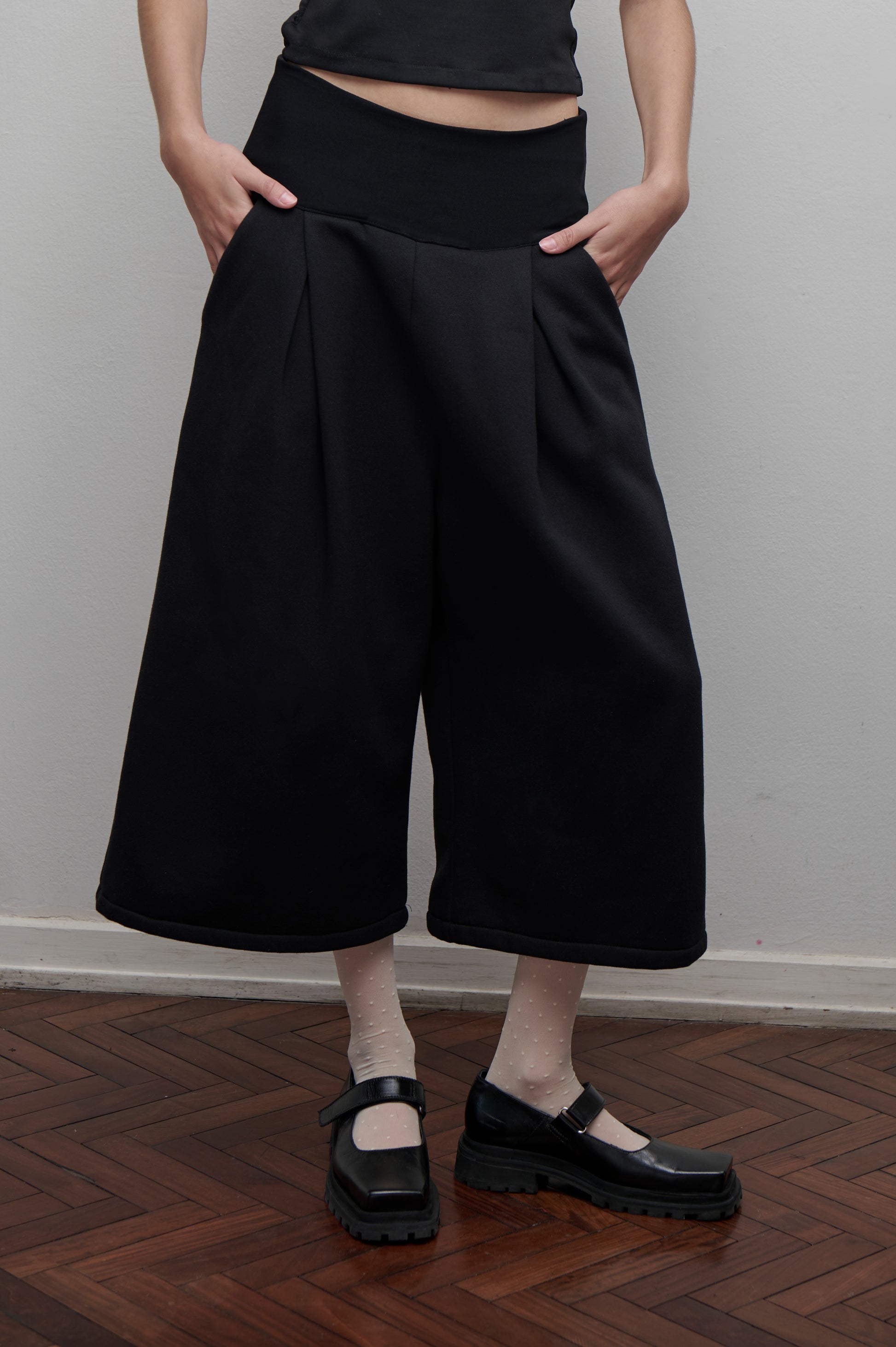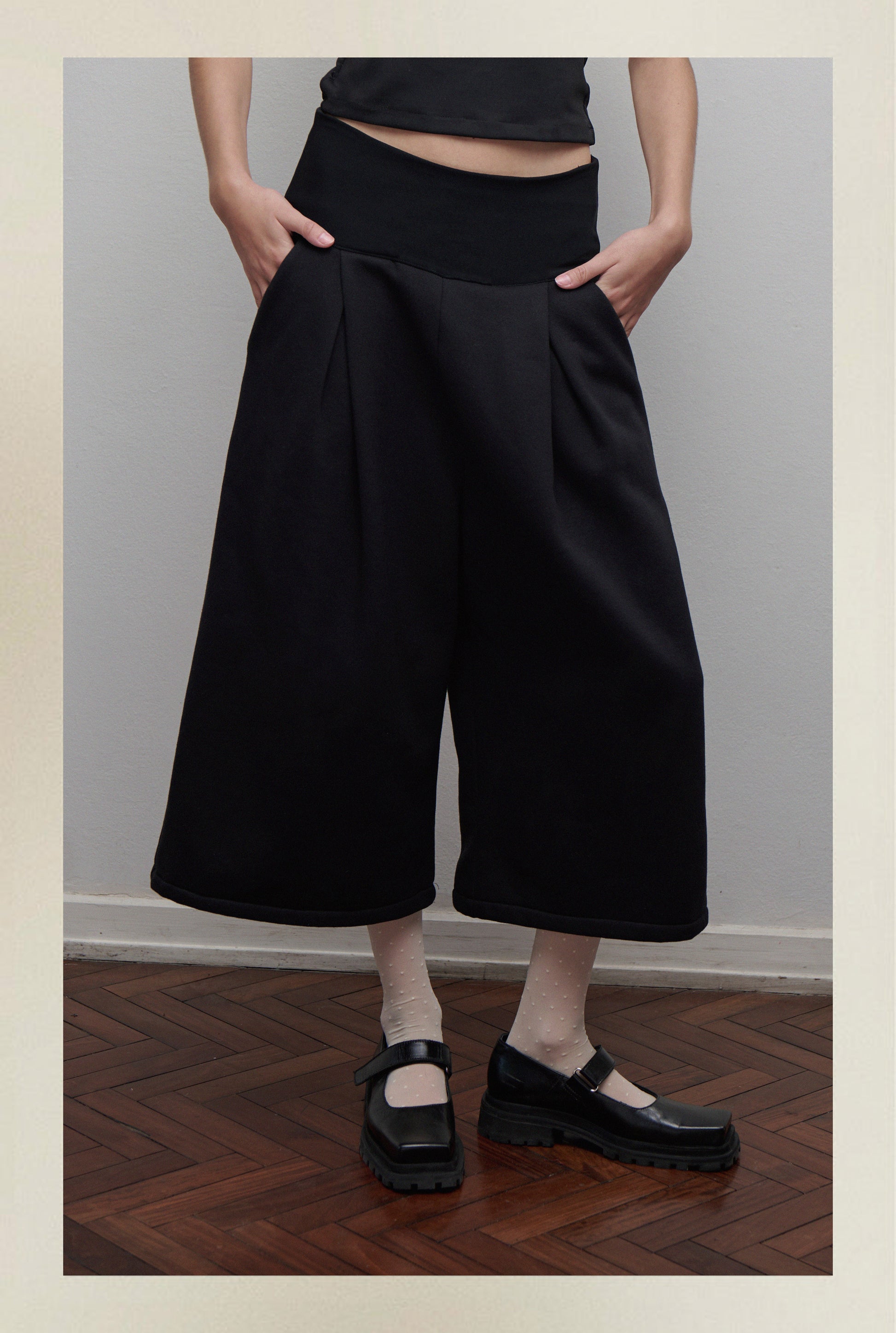 Una pieza confeciónada en felpa y pretina de lycra de algodón. Pretina elástica, tiro bajo, bolsillos laterales. Presenta un pliegue delantero de gran tamaño.
