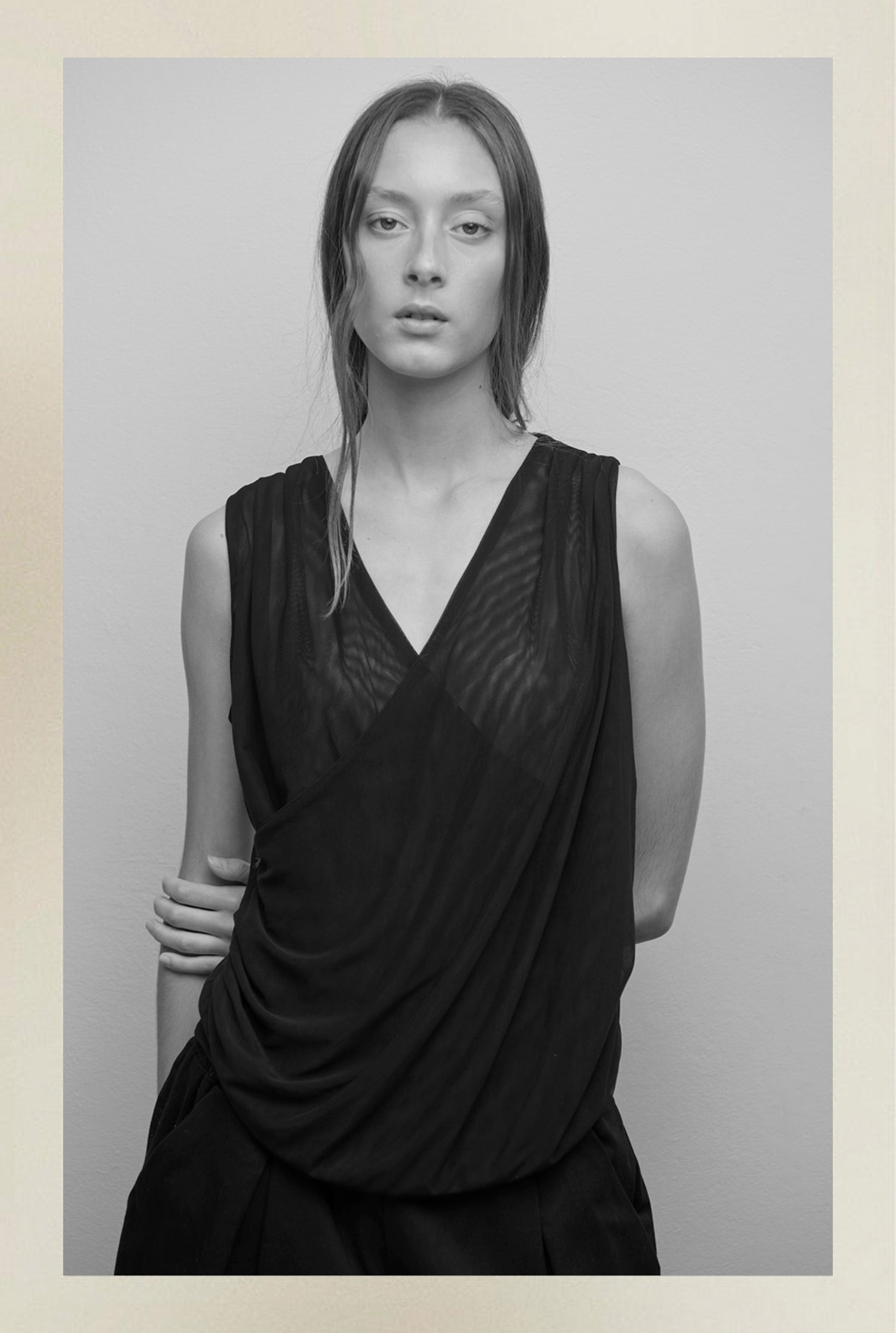 Top confeccionado en microtul doble, con escote cruzado en V y drapeado suave que aporta movimiento y textura. Su diseño liviano y translúcido equilibra estructura y fluidez, ideal para superponer o usar como pieza principal.