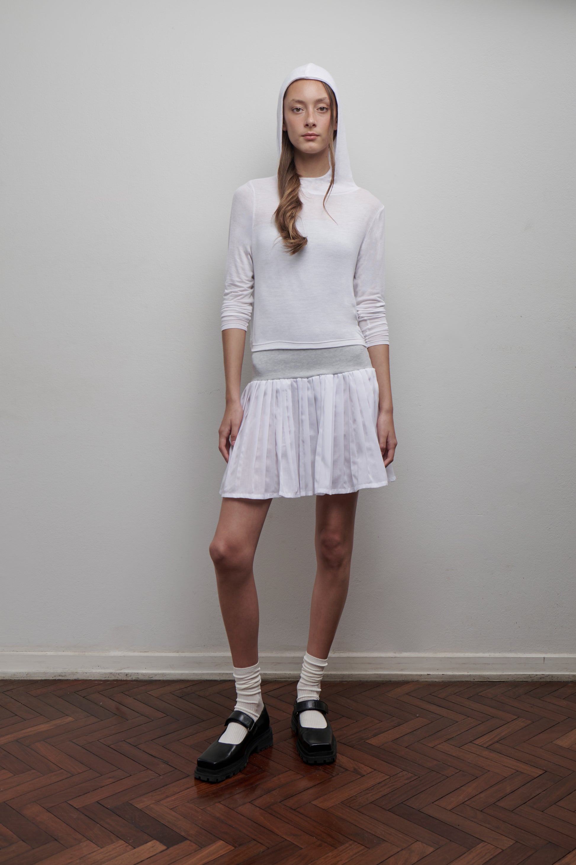 Buzo confeccionado en un textil fino, suave y ligero. Presenta capucha amplia y manga larga, con una silueta relajada que combina comodidad y fluidez