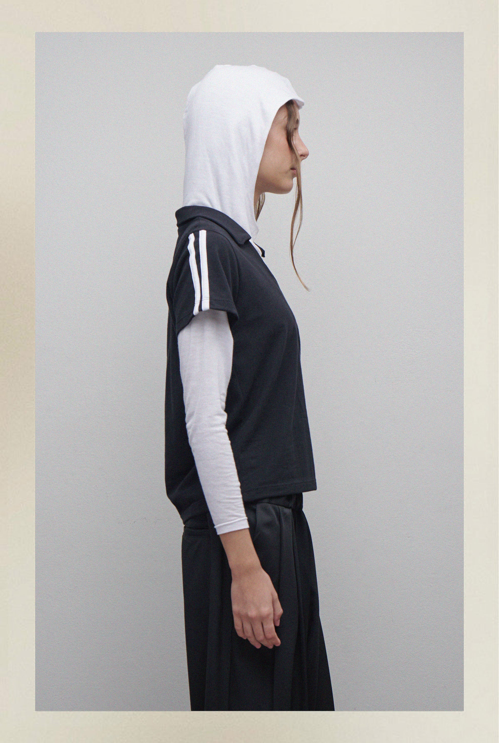 Camiseta confeccionada en remería de algodón, con cuello tipo polo y escote en V. Presenta dos líneas aplicadas en los laterales de cada manga, que aportan un detalle sutil y deportivo al diseño.