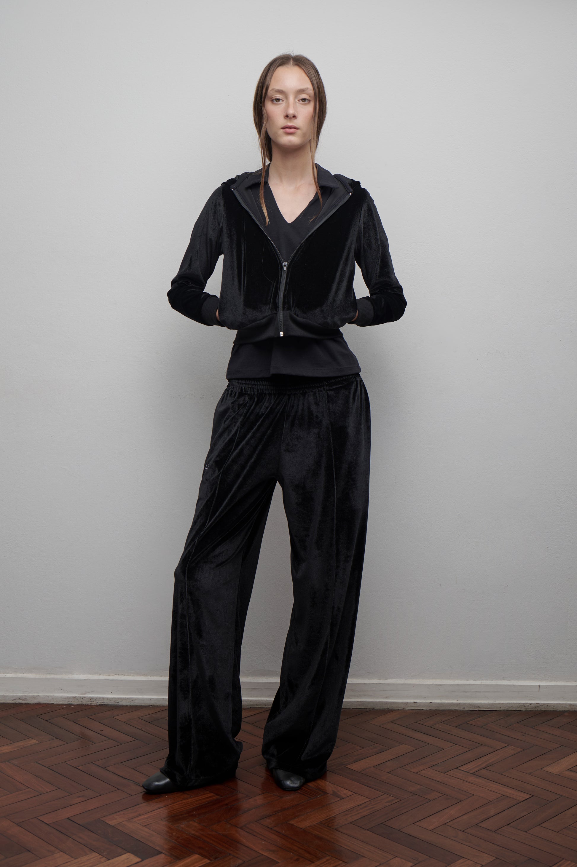 Una prenda que equilibra lo urbano con lo íntimo. Confeccionada en terciopelo negro brilloso y tacto suave, esta campera de silueta relajada cuenta con capucha, cierre frontal y bolsillos laterales funcionales. El ajuste sutil en puños y cintura le da estructura sin perder comodidad.