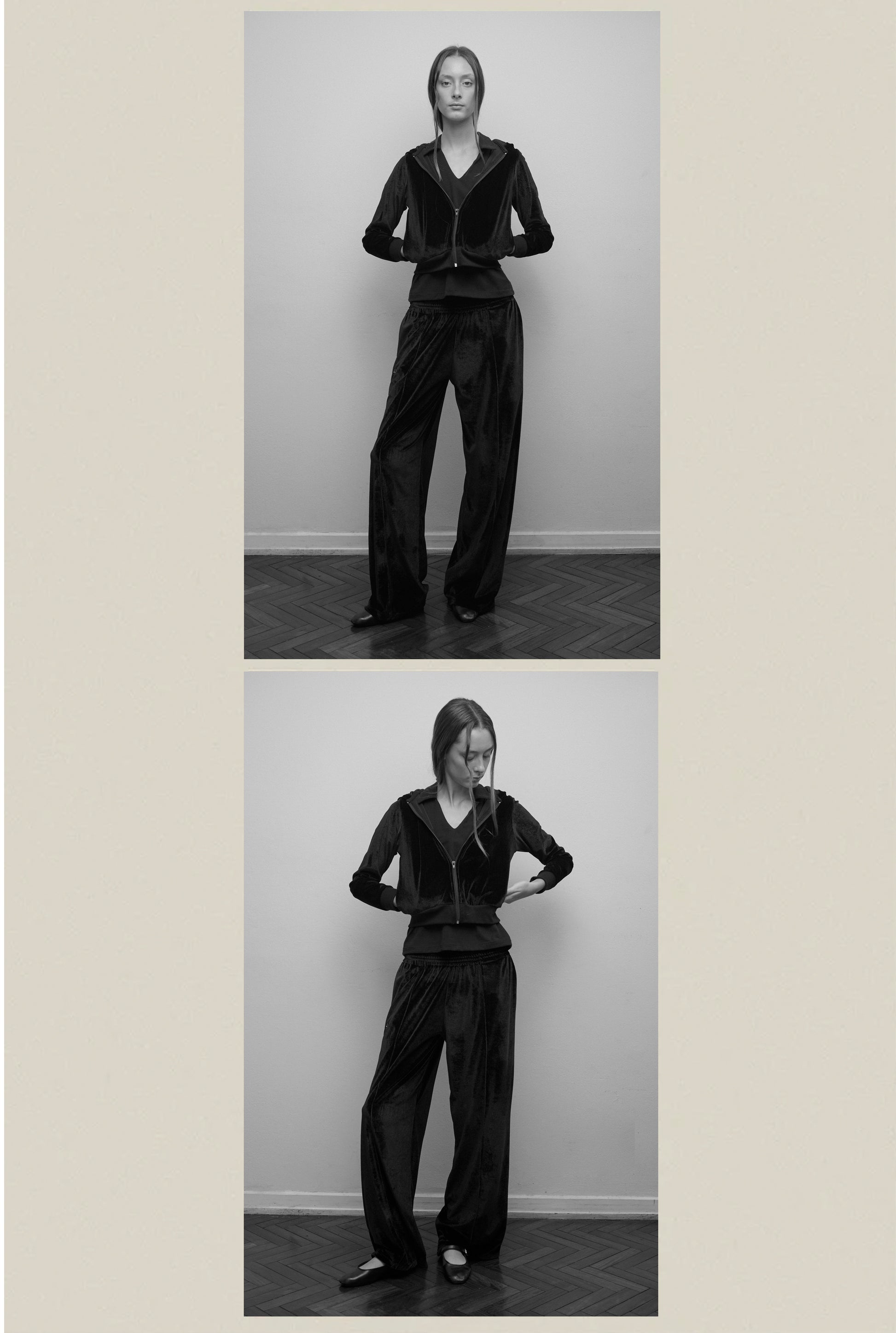 Confeccionado en terciopelo negro de textura suave y fluida, este pantalón se adapta al movimiento con una silueta amplia y relajada. Su diseño incorpora dos bolsillos laterales funcionales, cintura elástica y botamanga recta, logrando el equilibrio entre confort y estilo. Ideal para habitar lo cotidiano desde una estética atemporal y despojada.