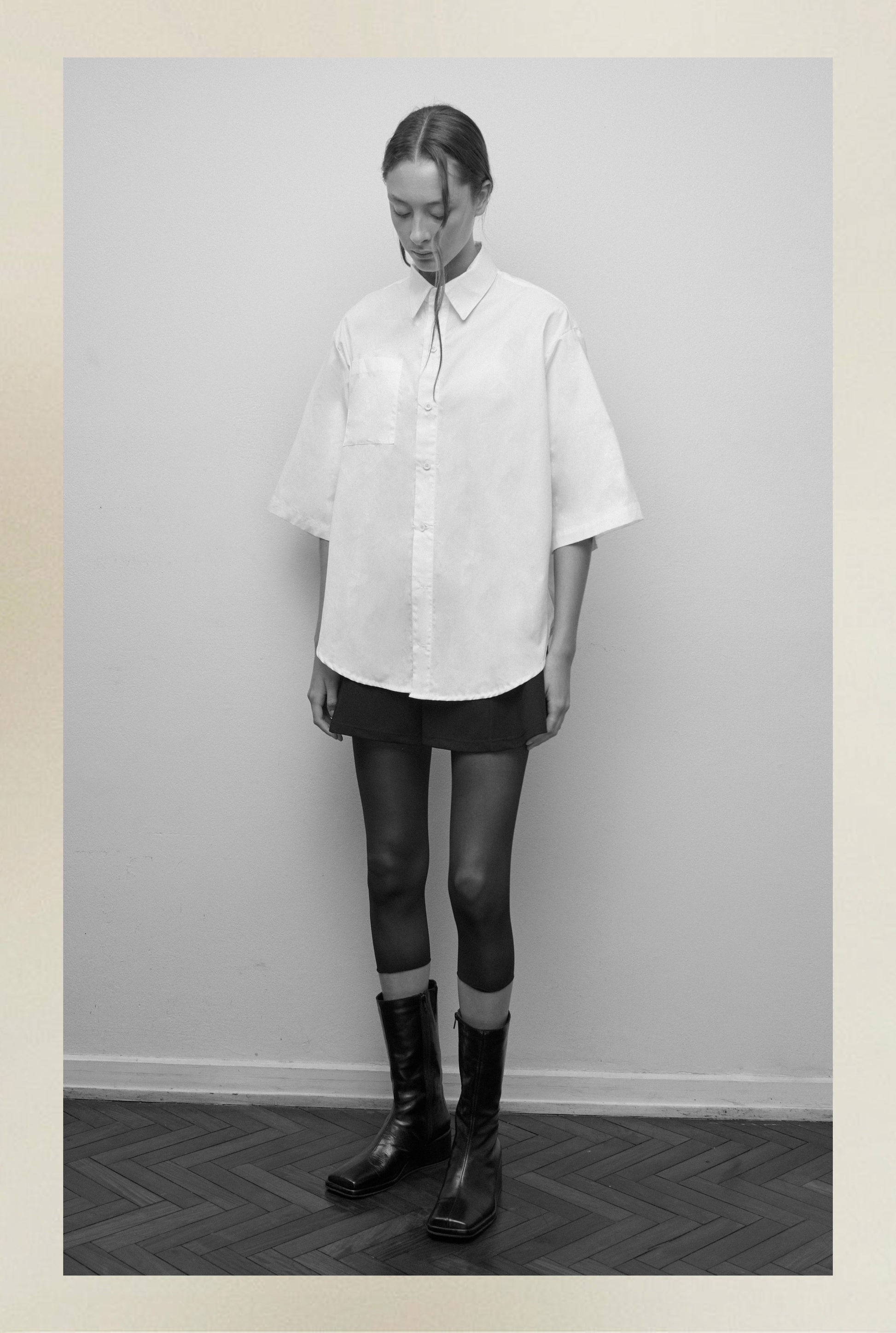 Short confeccionado en crep negro, de textura suave y cuerpo definido. Presenta un diseño con vuelo lateral que aporta movimiento y amplitud, manteniendo una silueta limpia, contemporánea y de caída estructurada
