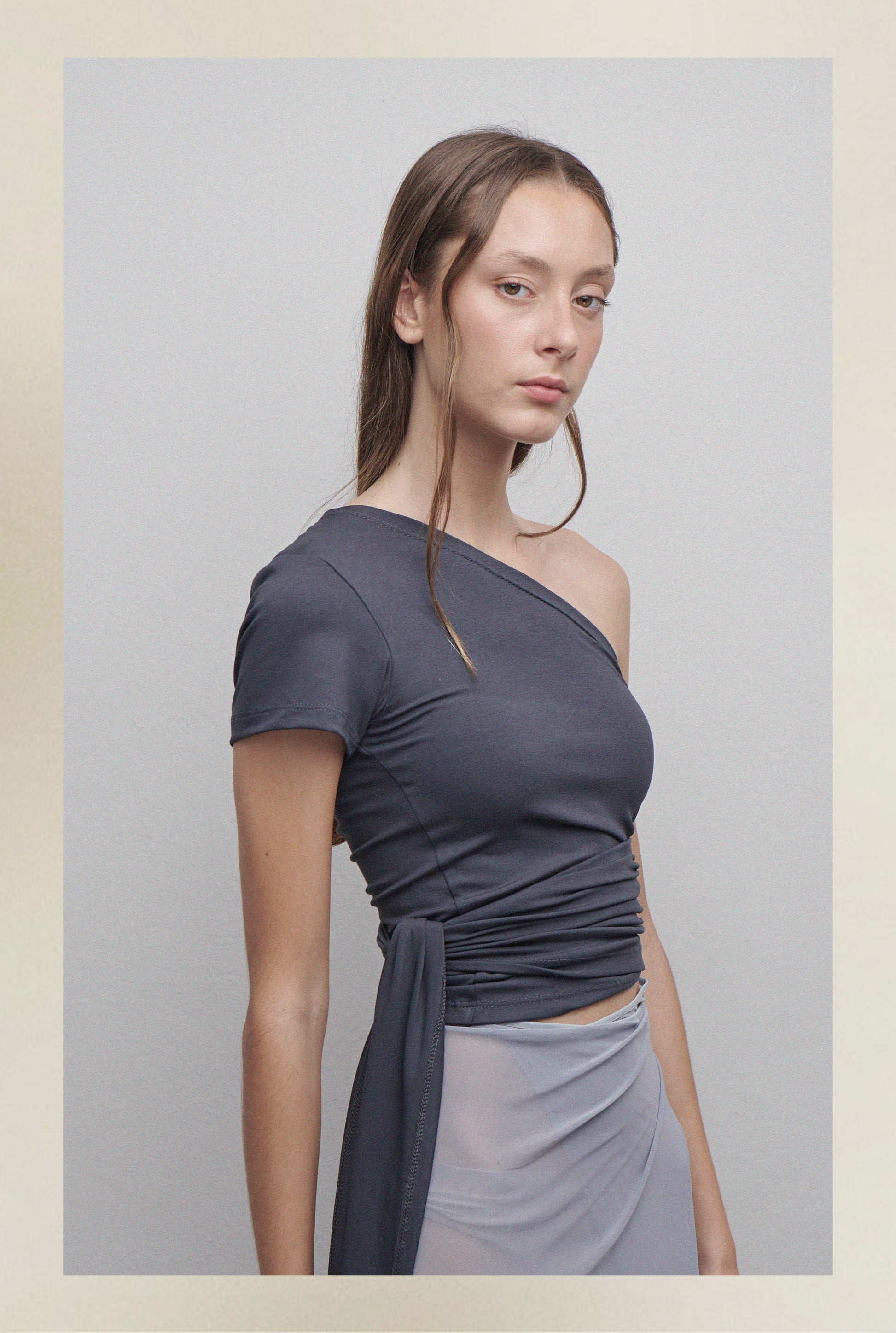 Top confeccionado en viscosa liviana y fresca. Diseño asimétrico de un solo hombro y manga corta, con ajuste al cuerpo y la posibilidad de anudarlo según tu preferencia.