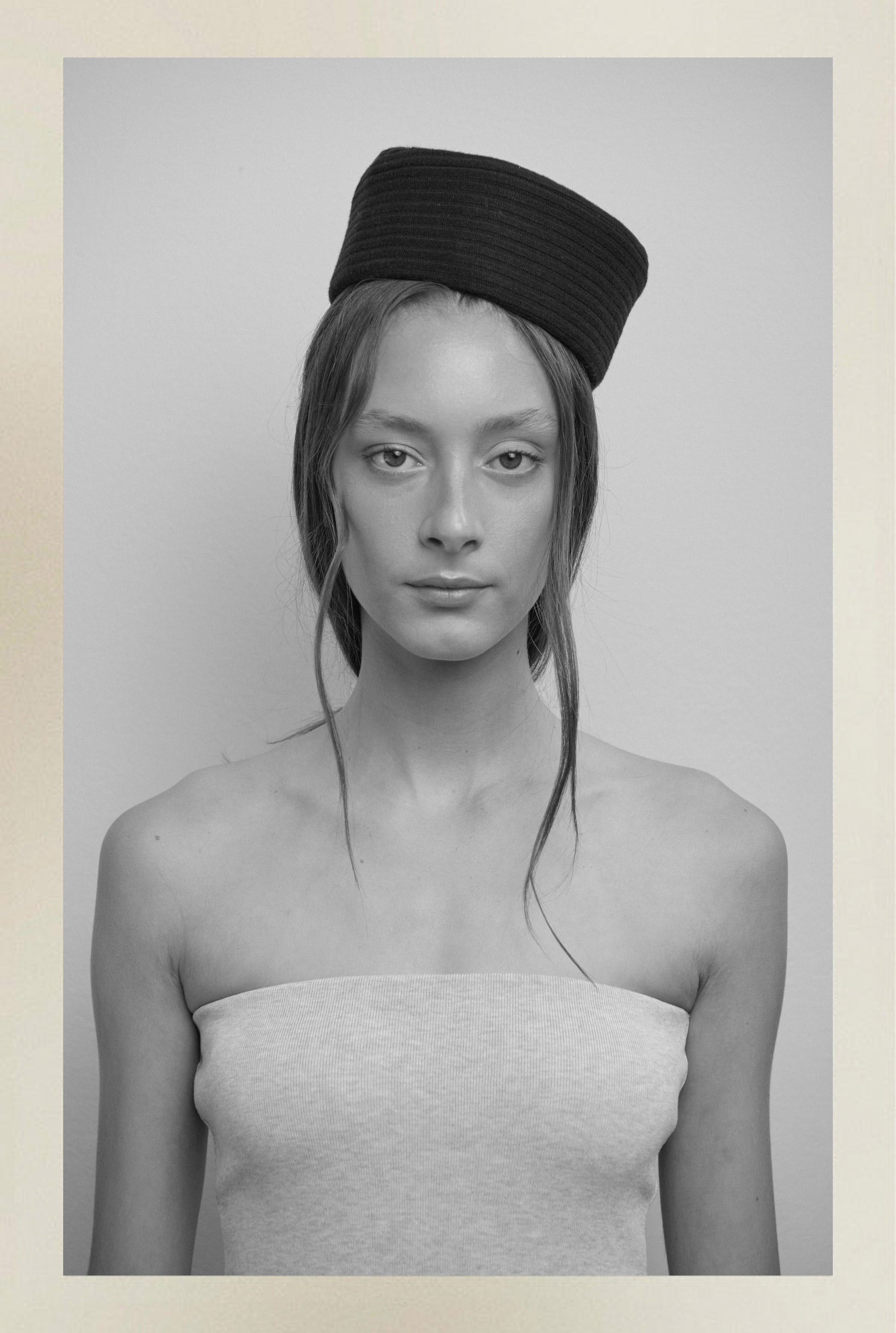 Top strapless confeccionado en puño de algodón gris con falda fruncida en popelina blanca. Combina texturas deportivas y sastreras, creando una silueta ajustada en el torso y con volumen en el bajo.